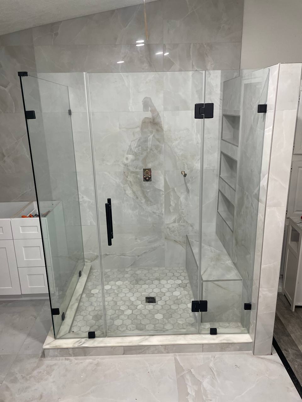 Installation of glass showers and screens in modern bathrooms, ensuring a clean and functional design that highlights the spaciousness of the space.
